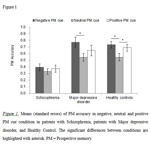 研究共招募了47名精神分裂症患者,22名抑郁症患者和37名健康对照者。这些被试完成了包含负性、正性和中性词语线索的前瞻记忆任务,要求被试在一个工作记忆任务中看到词语线索时记得完成前瞻记忆任务。