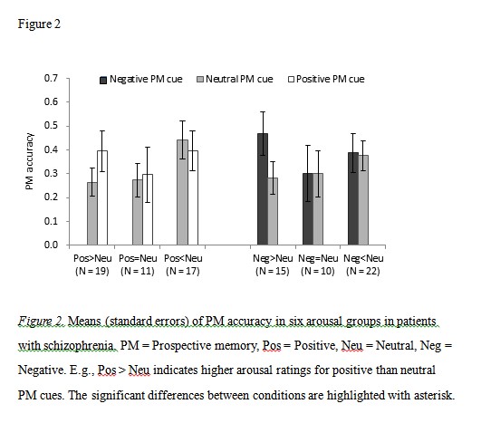 图2. 精神分裂症患者唤醒度知觉分组的前瞻记忆表现