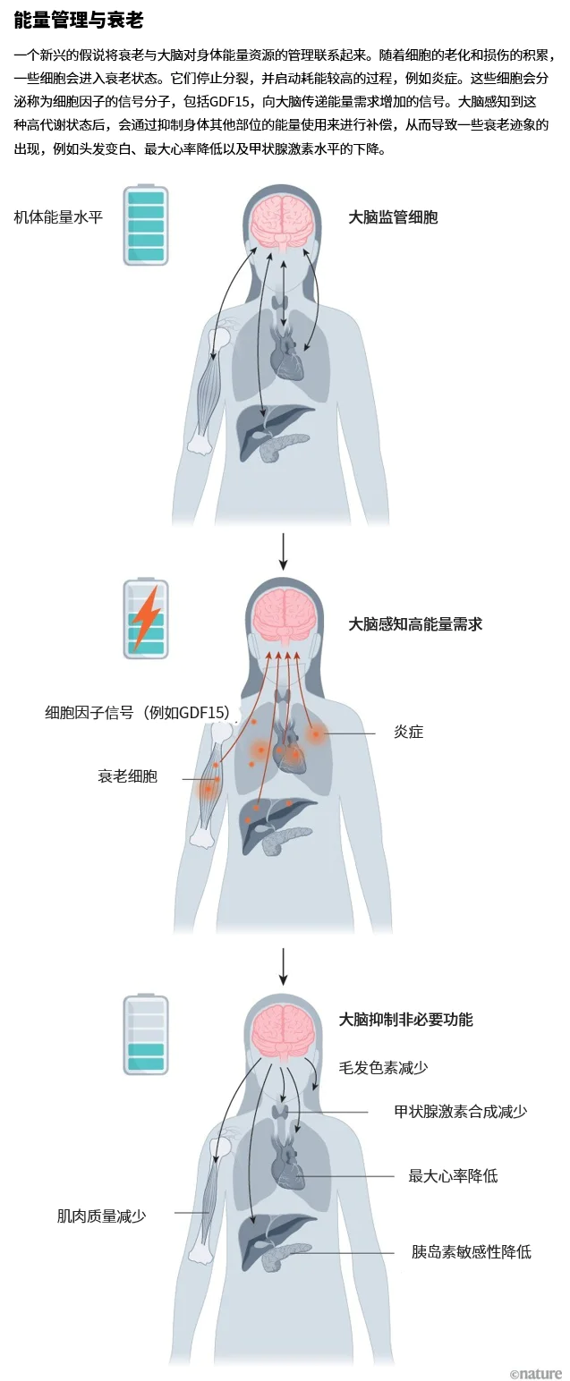 本文来自微信公众号:自然系列,作者:Nature Portfolio,原文作者:Diana Kwon,原文标题:《心理压力如何在分子层面加速你的衰老?》,题图来自:AI生成 衰老生物学中可能存在一个悖论:随着人类年龄增长,整体新陈代谢通常会变慢,肌肉质量减少,热量消耗也大幅下降。然而,老年人的某些细胞表现恰恰相反??它们消耗的能量比年轻时还要多。 这些潜在“能耗大户”是衰老细胞,即那些已经停止分裂、不再执行原有重要功能的老化细胞。纽约哥伦比亚大学的心理生物学家Martin Picard说,由于它们看起来闲着没事,生物学家曾认为,这些宛如僵尸的衰老细胞的能量消耗应低于仍在复制的年轻细胞。 但2022年,Picard的一位前研究生Gabriel Sturm细致观察了培养皿中人类皮肤细胞的整个生命周期[1](研究结果尚未全部发表),发现这些停止分裂的衰老细胞代谢速率竟然约为年轻细胞的两倍。 在Picard和同事看来,这种能量使用上的不匹配并不矛盾:衰老细胞会积累一些高能耗的损伤如DNA改变,并激活促炎信号。这与机体在衰老过程中总体能量消耗较低之间的对应关系尚不清楚,但研究人员提出一种假设:这种内在的能量紧张可能正是许多衰老负面效应的重要驱动因素,而大脑则可能在其中扮演着关键的调控角色[2]。他们认为,当某些细胞变老并对能量的需求增加时,大脑会作出响应,从其他生理系统中“抽调”资源来补偿,从而导致诸如头发变白、肌肉流失等肉眼可见的衰老特征(见“能量管理与衰老”)。