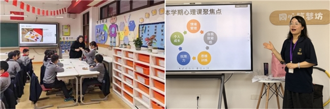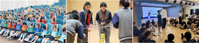 家长工作坊(左)心理节?合作大冒险(右) 世外(附属)临港外国语:守护心灵 向阳而生 世外(附属)临港外国语则是通过开展“呵护心灵,共筑健康人生”“我的‘颜色’,我做主”等多种心理活动,结合不同年级学生的心理发展特点,开展精准化活动引导。 针对九年级学生升学压力,学校举办心理嘉年华,通过心灵抖抖乐、烦恼大爆炸等趣味游戏,帮助学生释放压力、悦纳自我;针对二年级学生的自我认知启蒙需求,开展“认识我自己”的主题讲座,结合游戏互动,引导孩子接纳自我、树立自信,培养集体归属感。