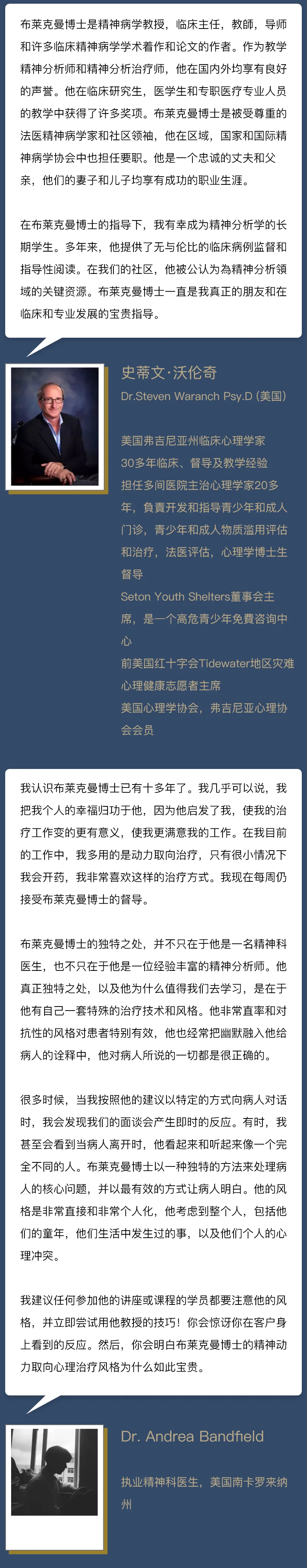 学成之后的布莱克曼,开始致力于培养年轻的精神动力取向心理咨询师,他深信,比起实现自己的梦想,帮助更多人实现成为专家级心理咨询师的梦想更有价值和意义。
